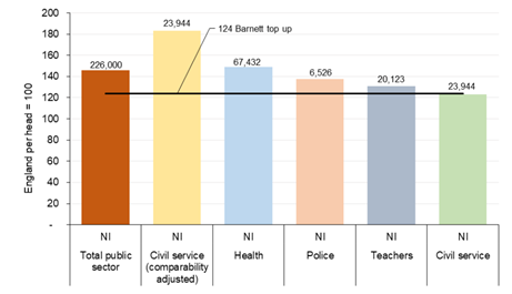 Public sector pay is the single biggest structural pressure facing NI. The Barnett formula does not automatically fund pay parity with England, and NI’s public sector is larger than England’s relative to its population. Matching pay increases in England therefore costs NI more than it receives in Barnett consequentials.